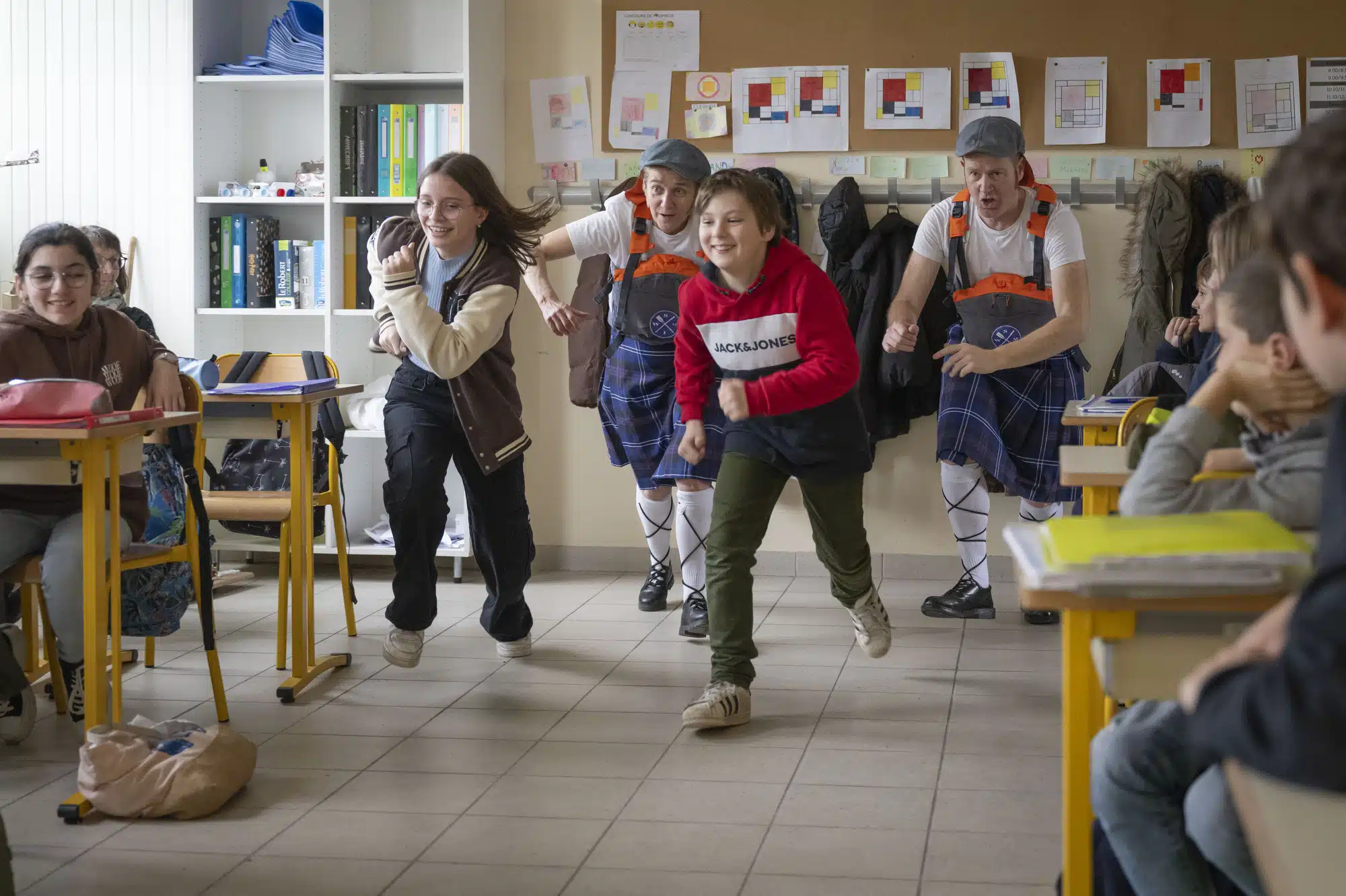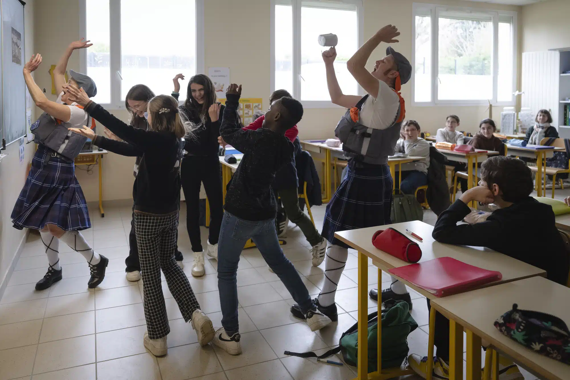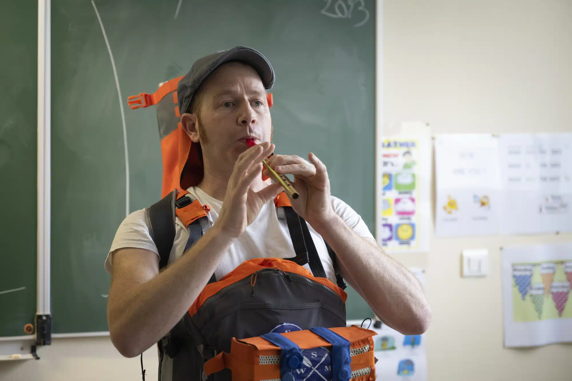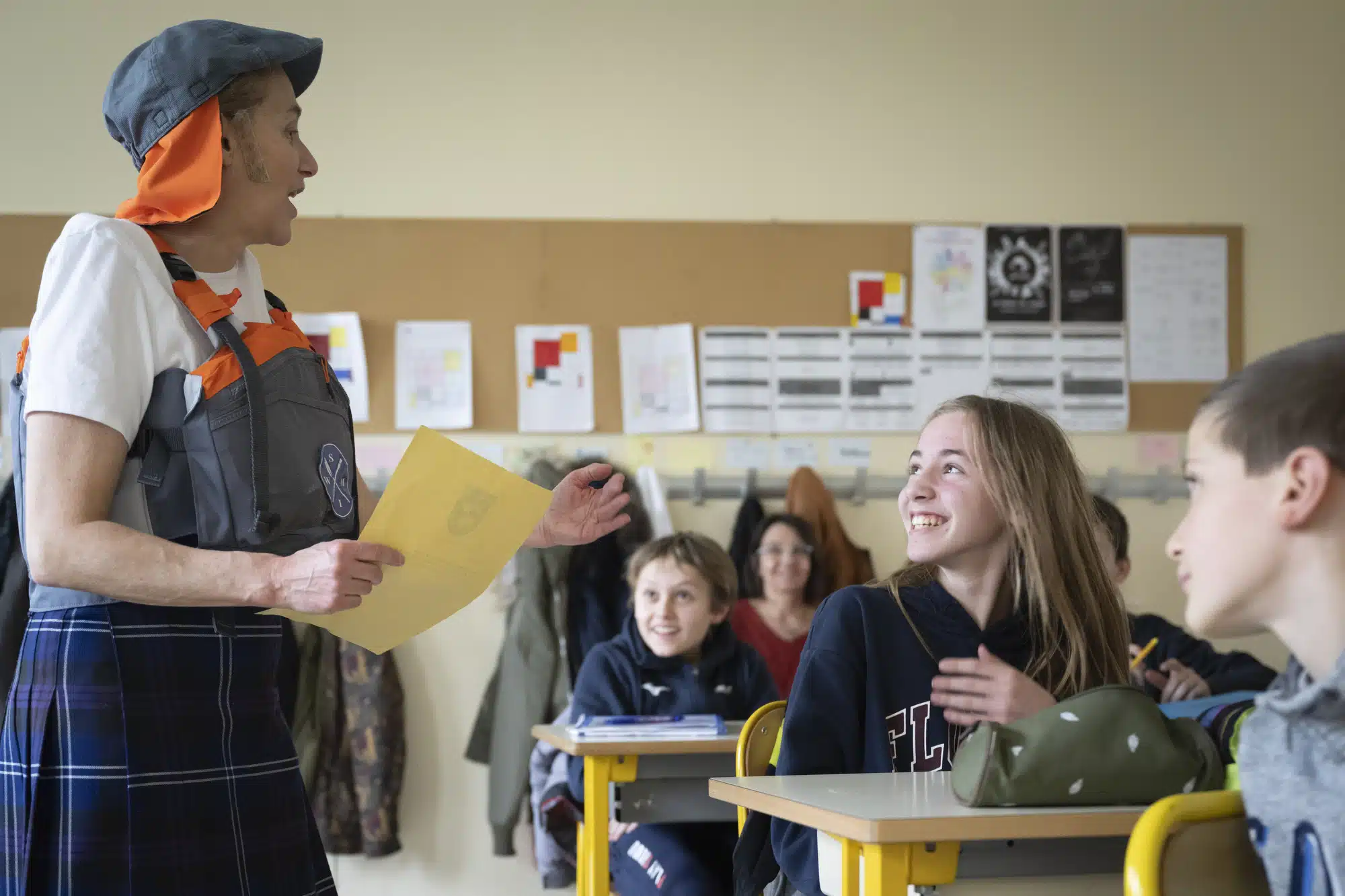Spectacle surprise pouvant être joué directement dans une salle de classe. Prévoir une chaise et l’accès au tableau. + un lieu dédié aux artistes en guise de cachette et de loge pour qu’ils puissent se préparer en toute discrétion.