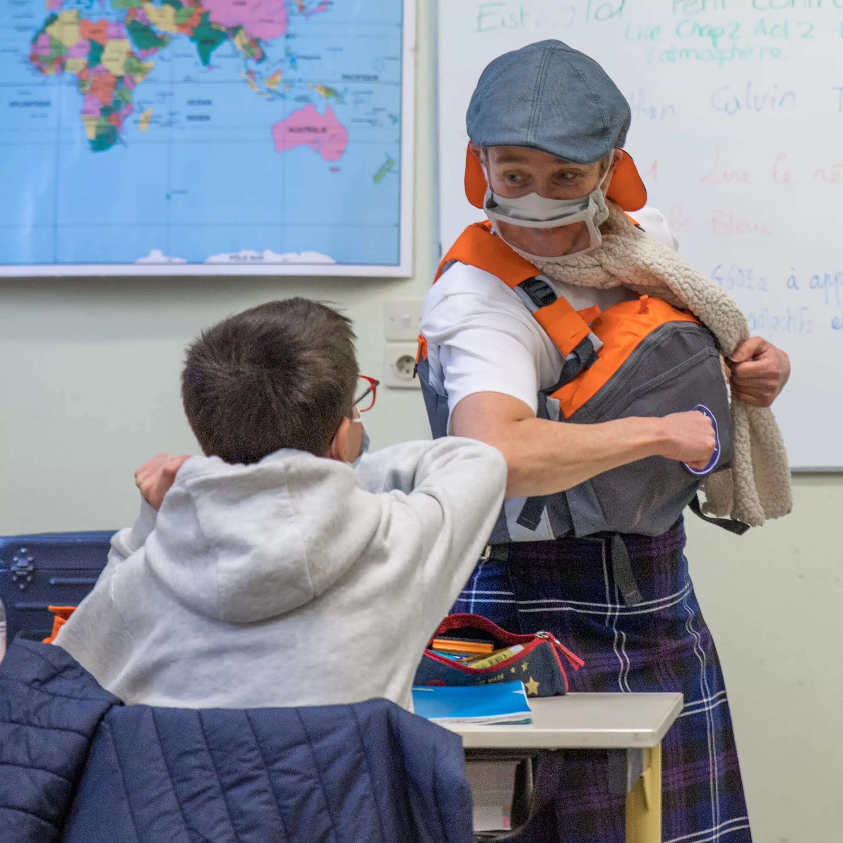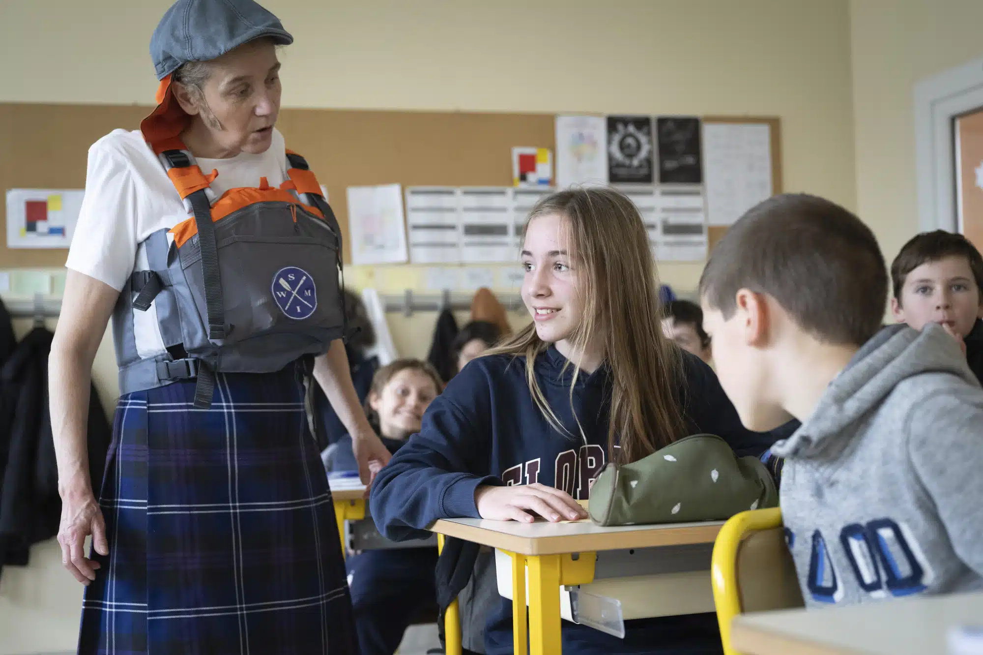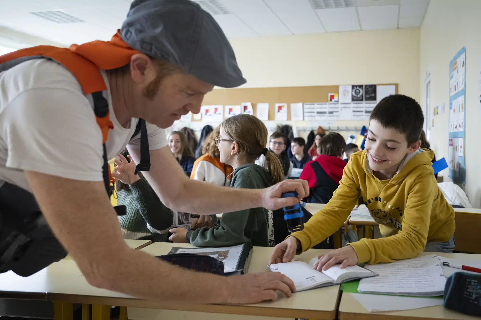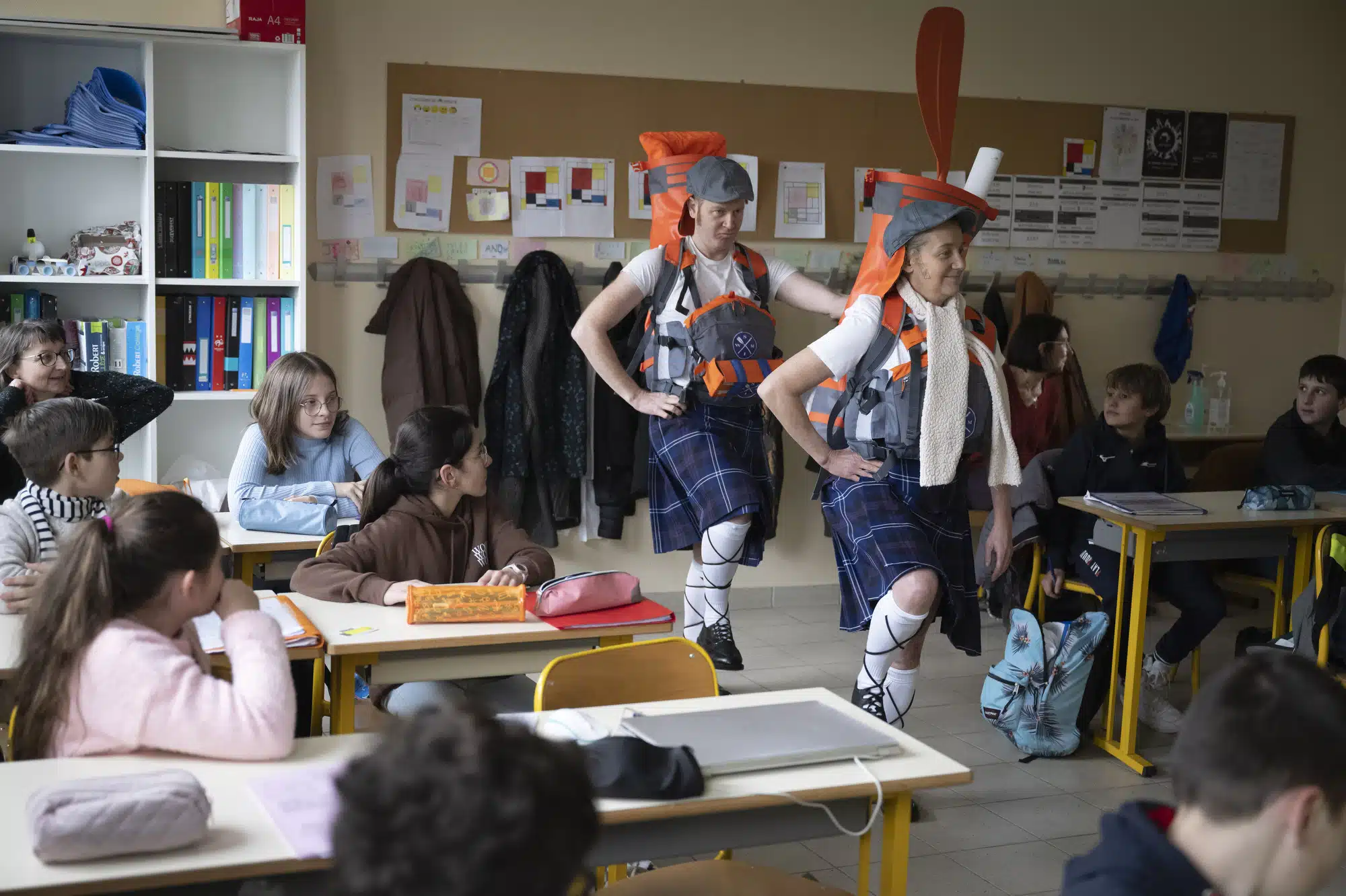 Spectacle surprise pouvant être joué directement dans une salle de classe. Prévoir une chaise et l’accès au tableau. + un lieu dédié aux artistes en guise de cachette et de loge pour qu’ils puissent se préparer en toute discrétion.